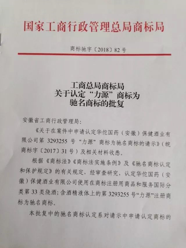 2018年4月17日,我公司“力源”商標(biāo),被國家工商行政管理總局商標(biāo)局認(rèn)定為“中國馳名商標(biāo)”,這是保健酒類的第三個(gè)“中國馳名商標(biāo)”,為公司品牌戰(zhàn)略的開展再添佳績,是公司自成立以來獲得的又一次重要榮譽(yù)。是對公司多年來發(fā)展壯大和品牌建設(shè)的充分肯定,對提高公司知名度、品牌形象有非常重大的意義。榮譽(yù)的獲得,是國家、社會(huì)、行業(yè)、及廣大用戶對公司產(chǎn)品質(zhì)量、服務(wù)與創(chuàng)新的肯定和認(rèn)可,是公司發(fā)展、創(chuàng)新、超越戰(zhàn)略的又一里程碑。